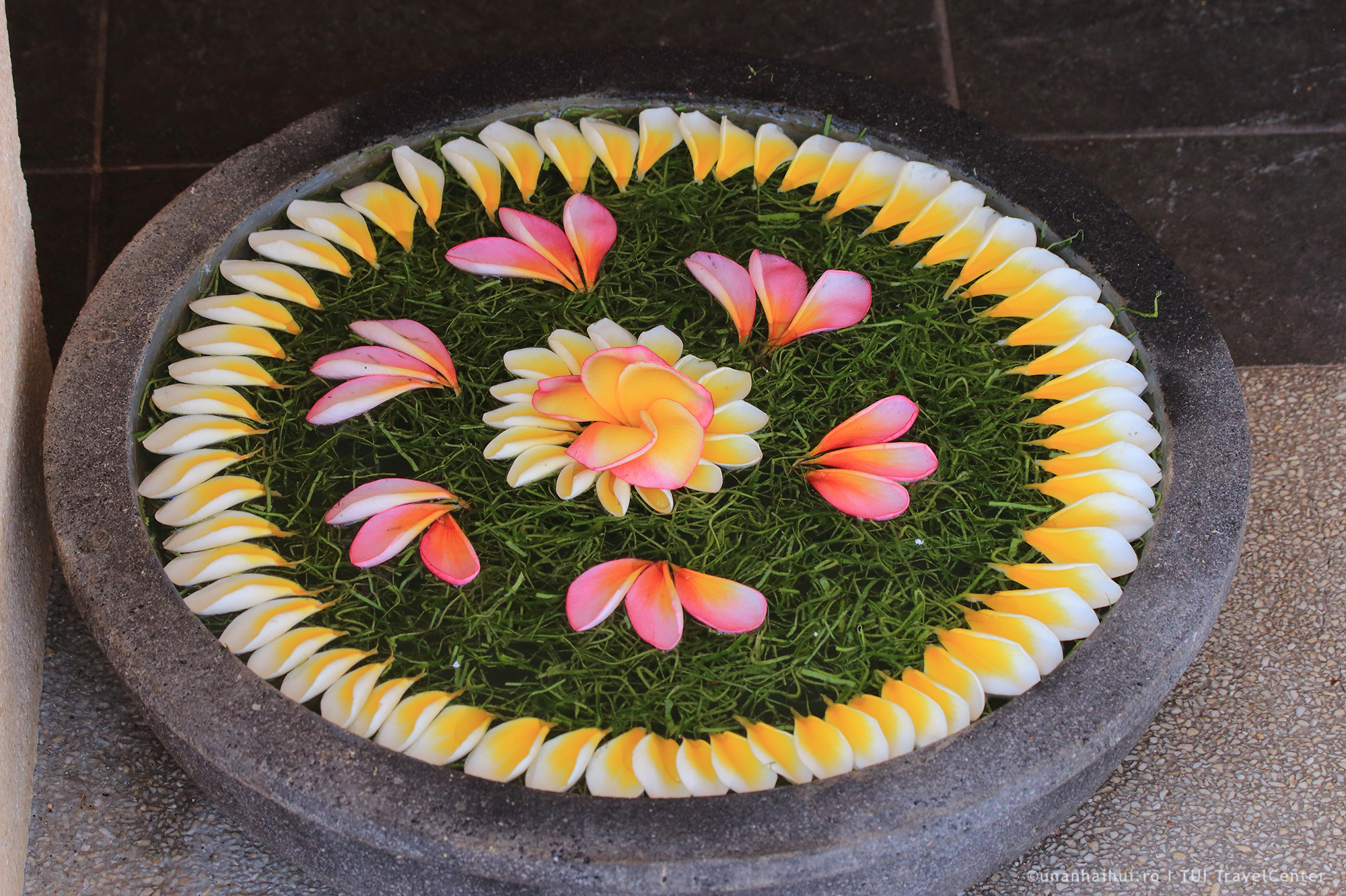 A trebuit sa ma uit de doua ori si din unghiuri diferite, pentru a ma convinge ca aranjamentele florale din vasele insirate de-a lungul aleilor nu sunt desenate! Indoiala mi-a fost alungata definitiv dimineata devreme, cand am vazut-o pe doamna care “picteaza” aceste ochiuri de apa cu petale aranjate ingenios in cercuri concentrice si suprapuse cu atata maiestrie ca par 2D.