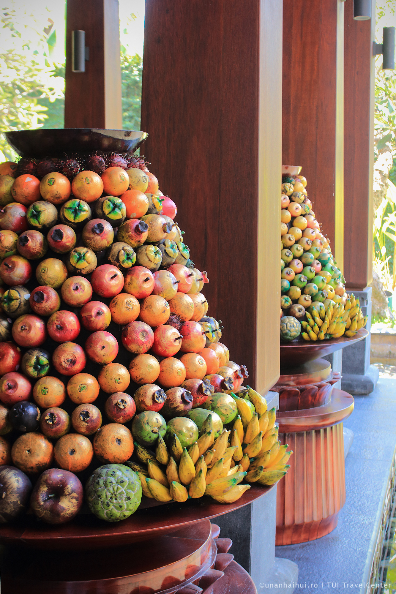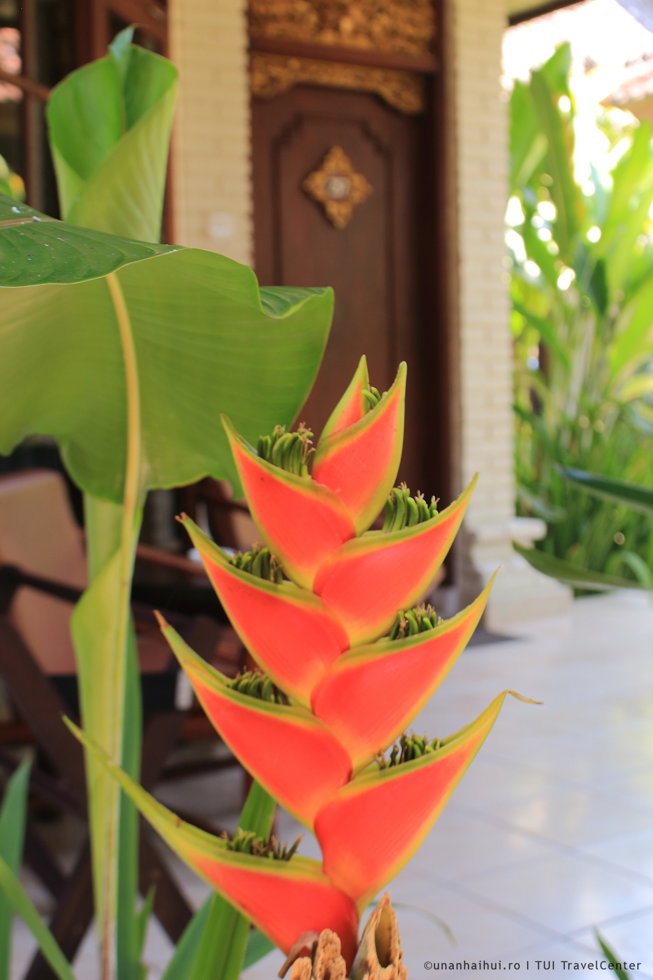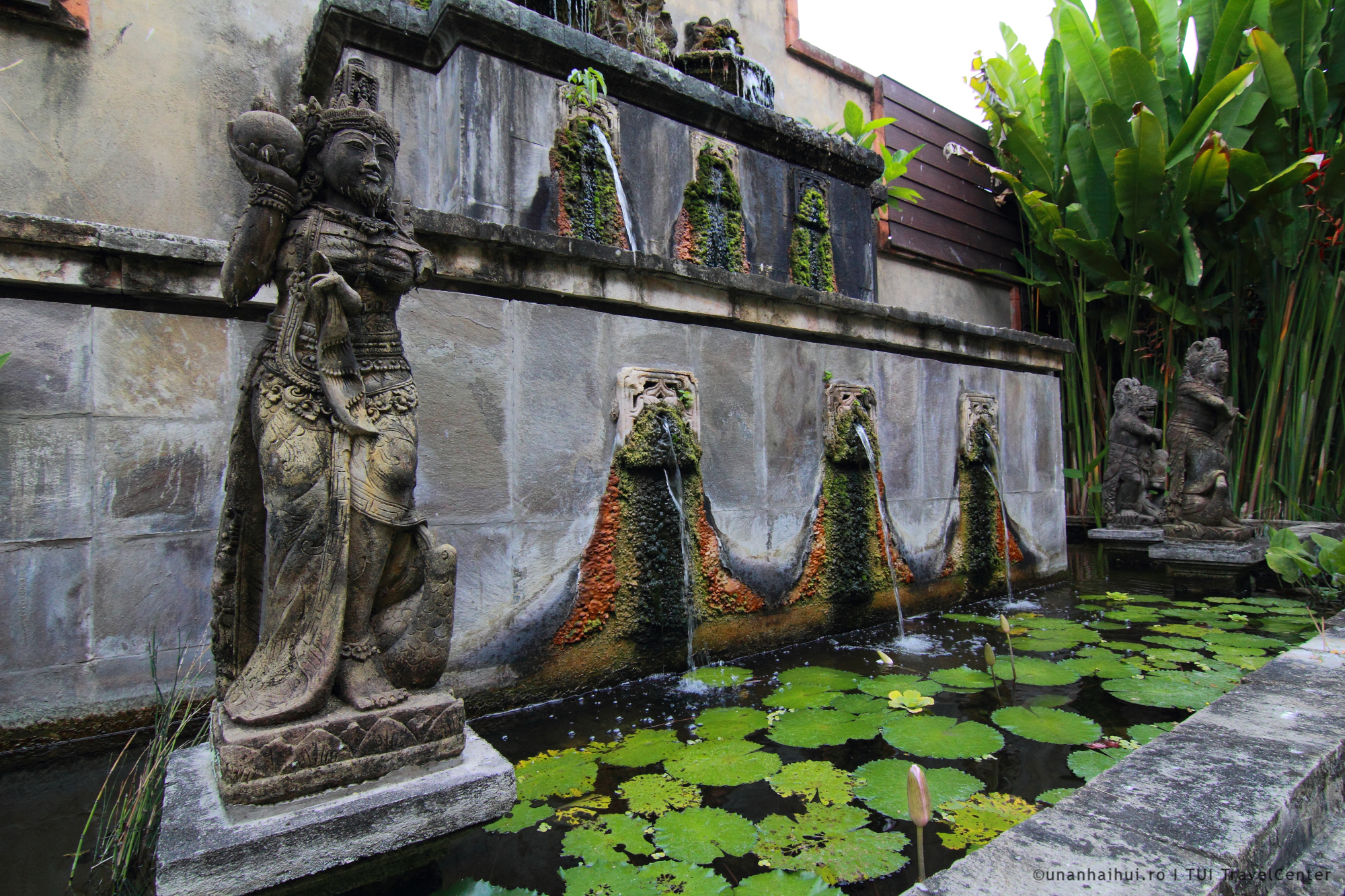 Desi am vazute zeci de piscine in documentarile noastre, asta a fost prima cu barongi (sculpturi ce reprezinta binele si raul, amplasate de regula pe post de gardieni la intrare) ce scuipa apa in albastrul cobalt de dedesubt. E confortabil, placut, relaxant. Aici ne-am ancorat de cum am venit, afisand mandrii doua coliere de flori orange pe care le primesc toti oaspetii.