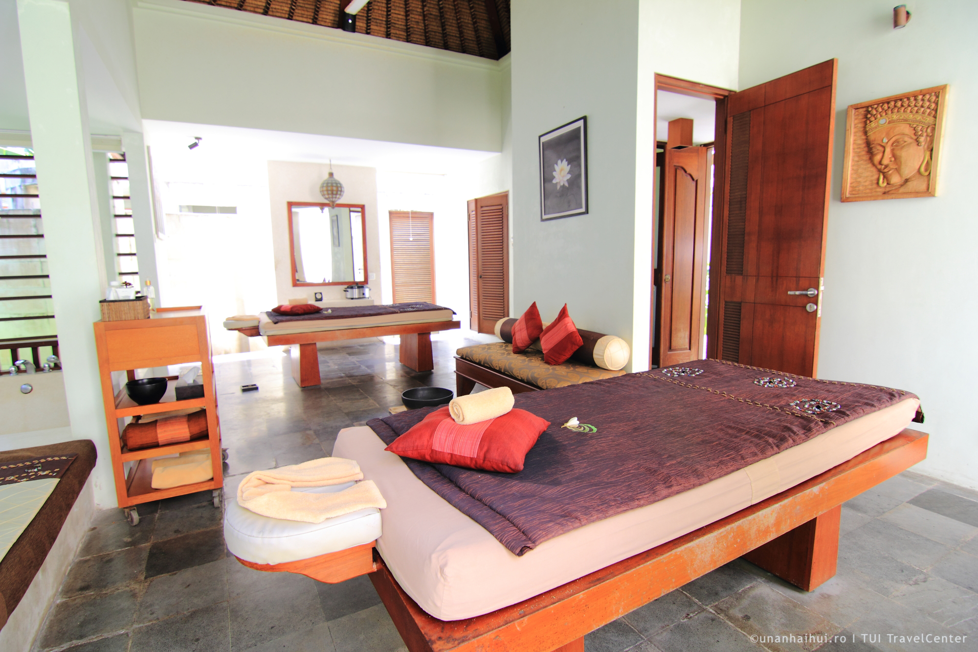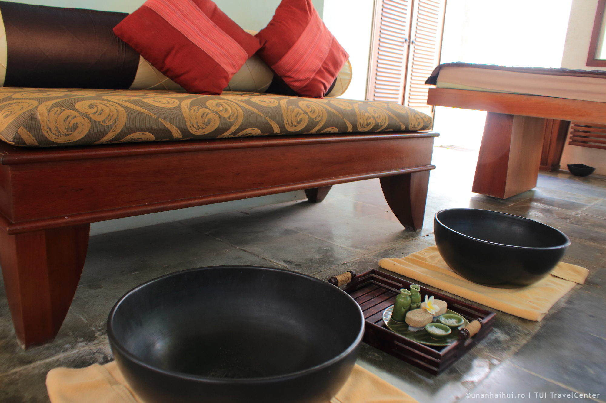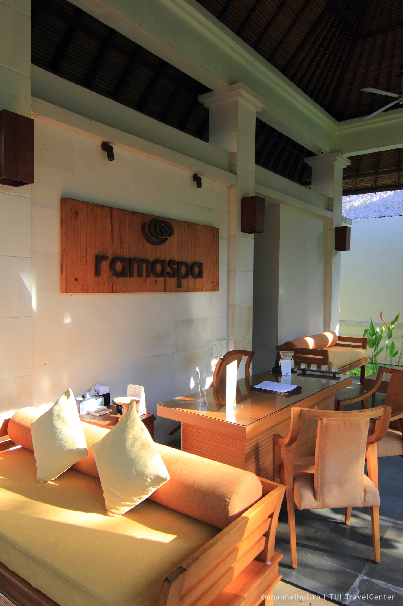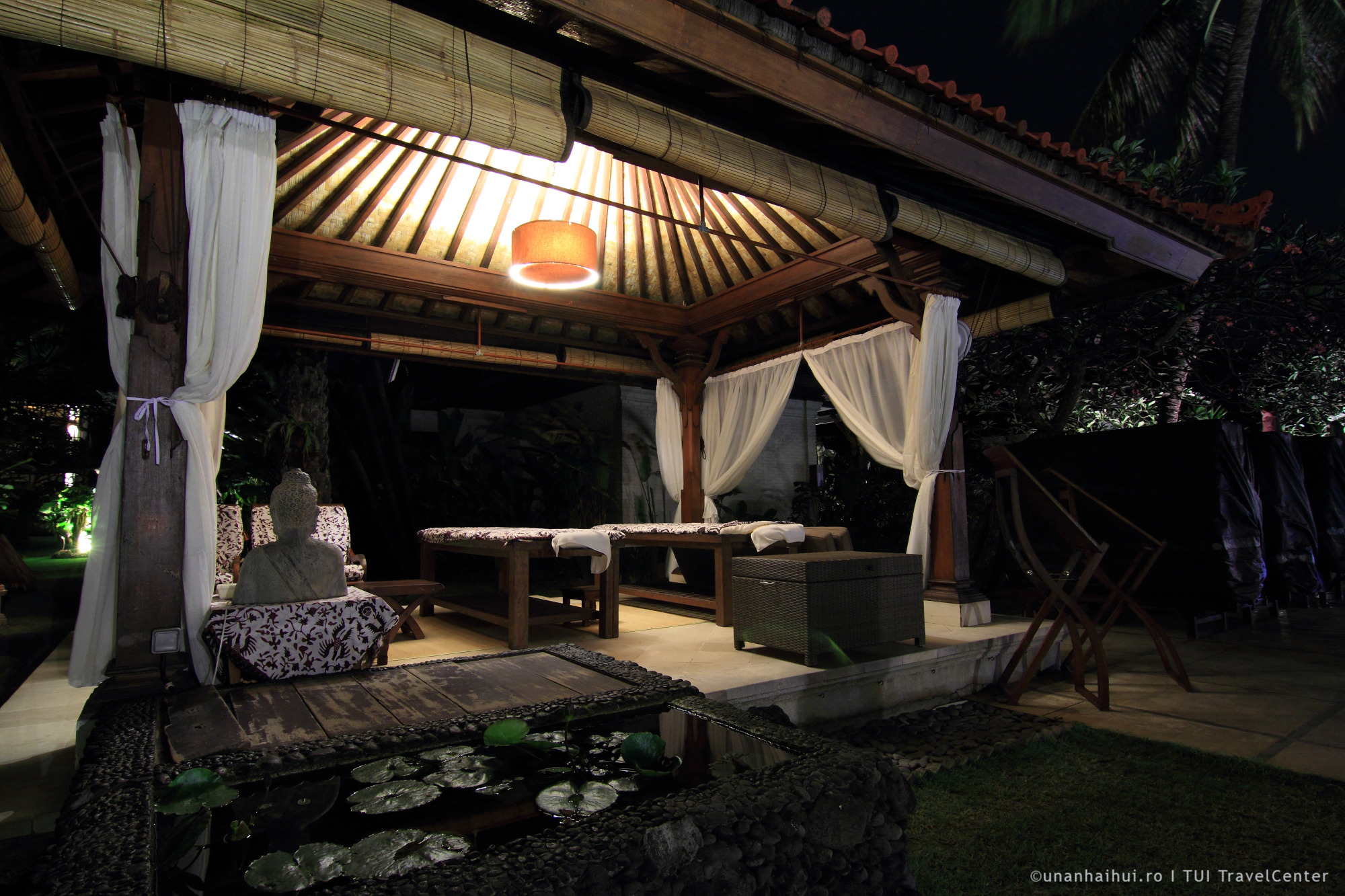 La intrare este un spatiu in care, pe zile, oaspetii au ocazia sa invete diverse lucruri. Multe dintre ele sunt gratuite si realmente interesante. Ma tenta sa impletesc si eu din frunze de palmier diverse obiecte, dar cand am ajuns noi era ziua in care se tinea cursul de masaj balinez! Asa ca ne-am indreptat spre SPA, nu inainte de a trage cu ochiul la zona de masaj in aer liber, in gradina, privind catre mare.