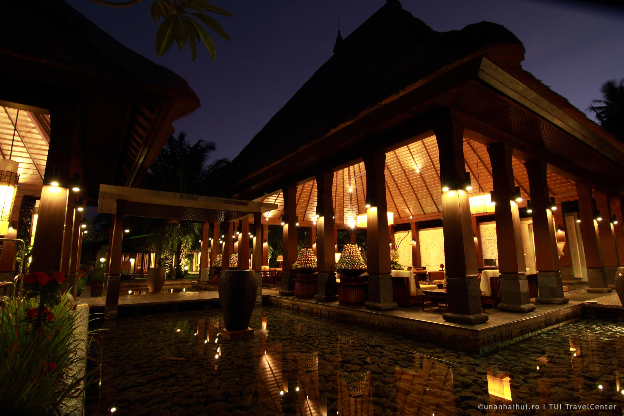 Seara, piscina este si mai spectaculoasa, cu jocuri de lumini ce tremura in apa. La fel ca si la prima ora a diminetii, dupa lasarea intunericului, este gol. Peste zi insa, toata lumea vrea sa prinda soarele filtrat de frunzele palmierilor si zona devine cea mai animata parte a resort-ului.
